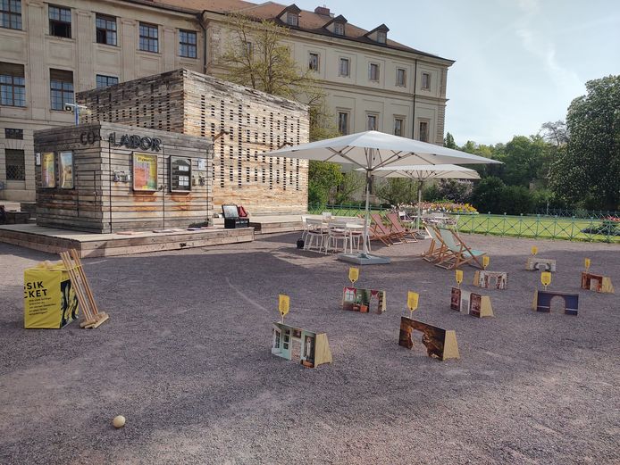 Rund um das Co-Labor warten die Spielekiste, das Klassik-Kroket mit spannenden Einblicken in die Gedankenwelt der Weimarer Klassik eine Mitmach-Station und Tischtennis auf euch – und wer mag, gönnt sich eine Pause bei kühlen Getränken im Liegestuhl.