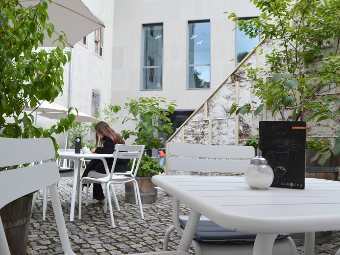 Der ruhige Innenhof am Samocca Café in Nähe der Herzogin Anna Amalia Bibliothek lädt zu einem gemütlichen Päuschen mit Kaffee und Kuchen ein. Der bestechend leckere Kuchen und weitere Speisen kommen aus eigener Manufaktur der Werkstätten Christopherushof und der Diakonie Landgut Holzdorf.