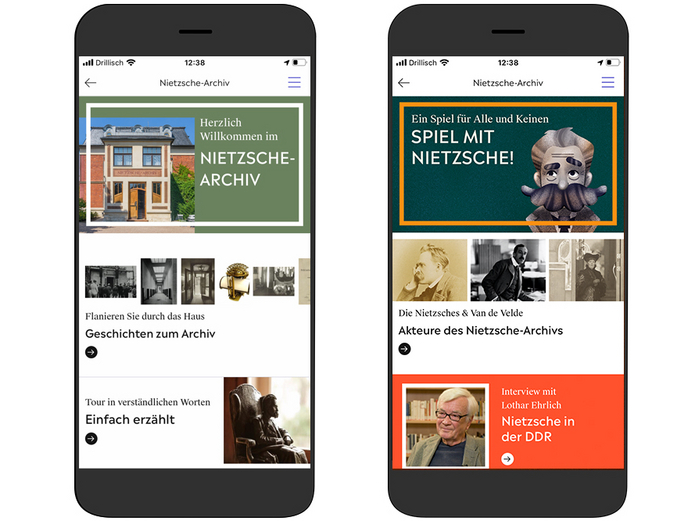 Die Weimar+ App ist Ihr multimedialer Begleiter durch das Nietzsche-Archiv. Entdecken Sie die Geschichte des Hauses, seiner Bewohner und erfahren Sie mehr über das Erbe des Friedrich Nietzsche. Das "Spiel mit Nietzsche" bietet zusätzlich einen spielerischen Zugang zur Ausstellung (Achtung knobelig!). Jetzt die App kostenfrei herunterladen!