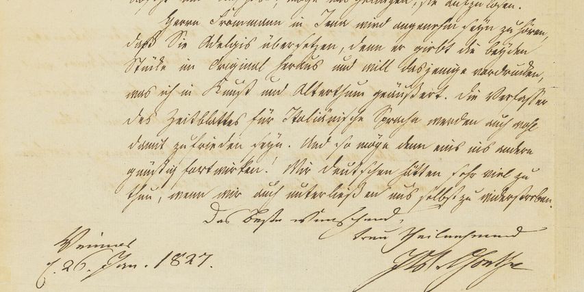 Bildnachweis: Seite 6 des vom Goethe- und Schiller-Archiv angekauften Goethe-Briefes an Streckfuß, 26.1.1827 mit Goethes eigenhändiger Schlussformel und Unterschrift: „Das beste wünschend, treu teilnehmend JWvGoethe“, ©Klassik Stiftung Weimar, Goethe- und Schiller-Archiv