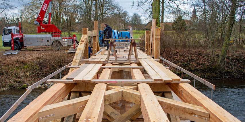 Nachdem die Klassik Stiftung im letzten Jahr die beiden Widerlager der Schafbrücke saniert und die Ufersicherung erneuert hatte, begannen zum Jahresbeginn 2020 die Montagearbeiten. Der verzögerte Start ergab sich aus aufwendigen Planungen zur Detailstatik. Dank der vorgefertigten Holzbauteile geht der Aufbau nun aber rasch voran. Inzwischen ist das spätere Aussehen der Brücke bereits erkennbar. In den nächsten Wochen folgen die oberseitige Verblechung der Balken zum konstruktiven Holzschutz, ein Bohlenbelag aus Eichenholz und das Geländer. Die Eröffnung der Schafbrücke ist nach der Wiederherstellung der angrenzenden Wege für Mai 2020 geplant.