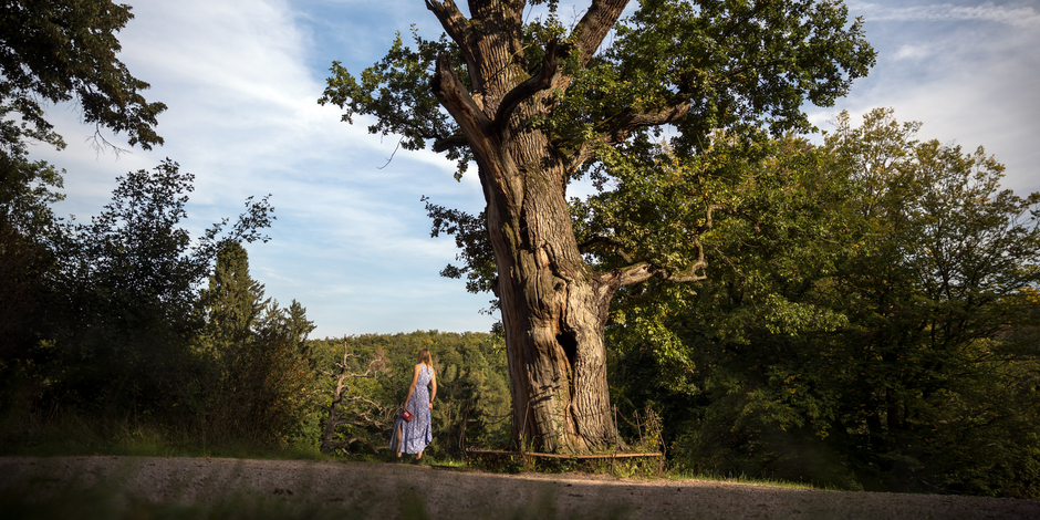 Frau im blauen Kleid steht mit dem Rücken zur Kamera neben einer alten EicheFoto: Gordon Welters © Klassik Stiftung Weimar