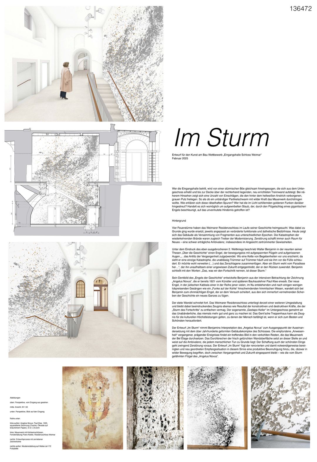 Die künstlerische Entwurfsidee geht in poetischer Weise von der Spezifik dieses zentralen Geschichtsorts im Kosmos Weimar aus und verflicht diesen Schauplatz unentwegter historischer Zerstörungen, Überschreibungen und Neuformungen überzeugend mit einem der wichtigsten geschichtsphilosophischen Texte des 20. Jahrhunderts, mit Walter Benjamins 9. These „Über die Geschichte“ sowie mit dem ihn inspirierenden Werk „Angelus Novus“ des Weimarer Bauhaus-Meisters Paul Klee. Damit erhält die abstrakte Arbeit einen explizit nicht illustrativen Ortsbezug, der die ganze Ambivalenz von Zerstörung und Neuschöpfung beinhaltet. Die intellektuelle Stringenz dieses Konzepts spiegelt die Konzeptualität der Weimarer Klassik und der Bauhaus-Moderne und damit die ganz eigene Qualität Weimars.