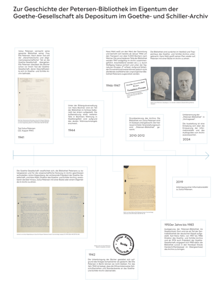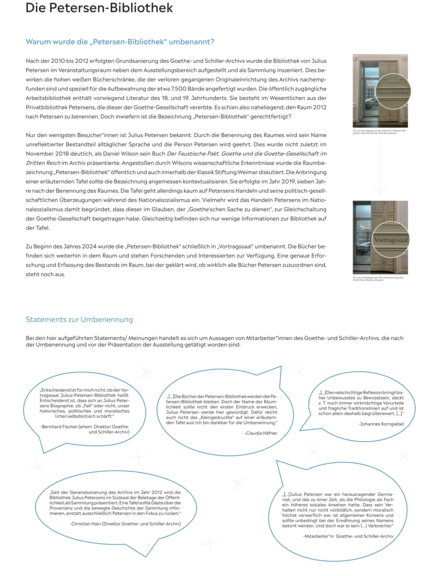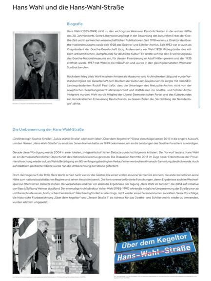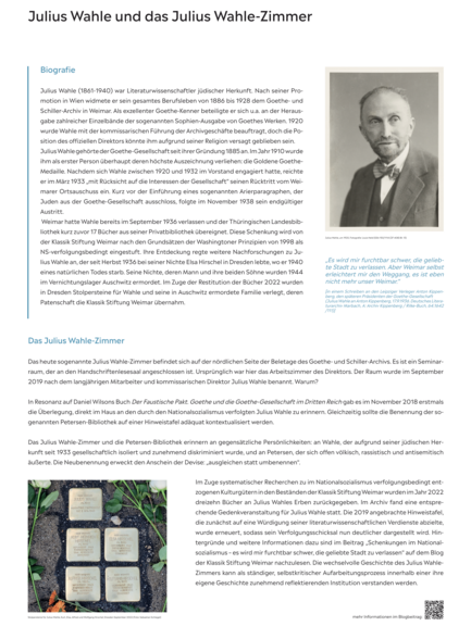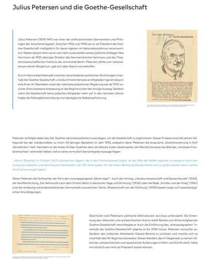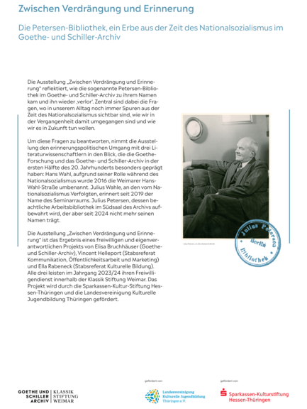 Die Präsentation nahm den erinnerungspolitischen Umgang mit drei Weimarer Literaturwissenschaftlern in den Blick. Im besonderen Fokus stand dabei der langjährige Präsident der Goethe-Gesellschaft Julius Petersen und sein Wirken in der Zeit des Nationalsozialismus. Neben Petersen wurde Hans Wahl (1885-1949) als einer der einflussreichsten Germanisten Weimars und von 1928 bis zu seinem Tod 1949 Direktor des Goethe- und Schiller-Archivs thematisiert, dessen Handeln von einer Nähe zum nationalsozialistischen Regime zeugt. Julius Wahle (1861-1940) wiederum, jüdischer Literaturwissenschaftler, langjähriger Mitarbeiter und vor Wahl kommissarischer Direktor des Goethe- und Schiller-Archivs, war den Repressalien der Nationalsozialisten ausgesetzt. Alle drei prägten die Goethe-Forschung und das Archiv in der ersten Hälfte des 20. Jahrhunderts auf besondere Weise. Das Projekt beleuchtete Prozesse von Anpassung und Ausgrenzung und stellte die Frage, was von ihrem Erbe bleibt.